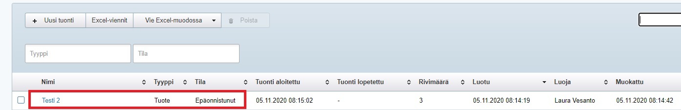 - Voit klikata virheellisten rivien määrää ja siirtyä käsittelemään ne uudelleen, tai palata myöhemmin Tietojen tuonti -ohjelmaan, klikata auki Epäonnistunut-tilassa olevan tietotuonnin ja tarkistaa virheelliset rivit: