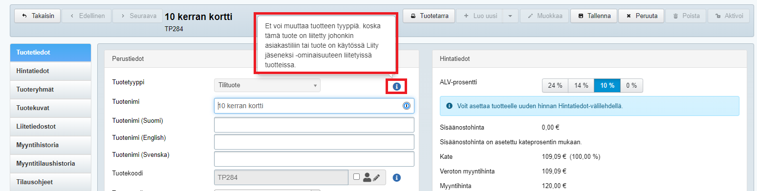 Jos tuotteen tuotetyyppiä ei voi vaihtaa, näkyy Tuotetyyppi-rivin vieressä infokuvake. Kun viet hiiren osoittimen sen päälle, näet syyn siihen, miksi tuotetyypin vaihtaminen on estetty: