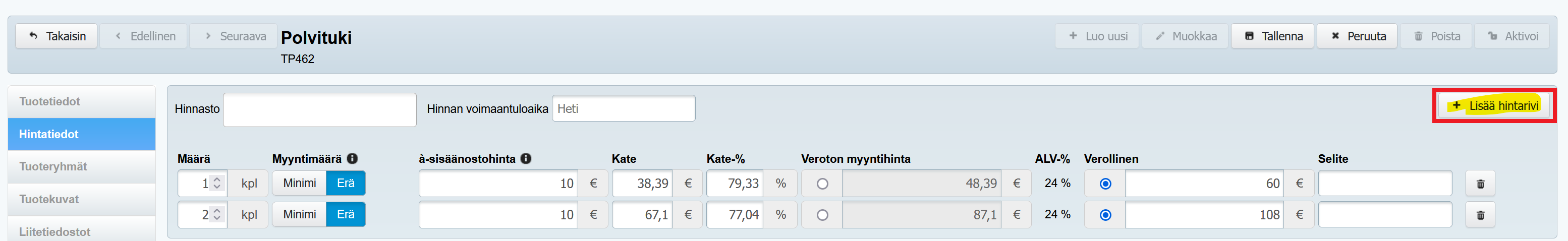 - Jos samalla tuotteella on useampi kuin yksi hintatieto (esim. hinta yksittäin on eri kuin isommissa erissä), klikkaa Lisää hintarivi -painiketta. Merkitse hintariville määrä, jota hinta koskee, sekä tuotteen sisäänostohinta (per kpl, ilman veroa) ja myyntihinta tälle määrälle.