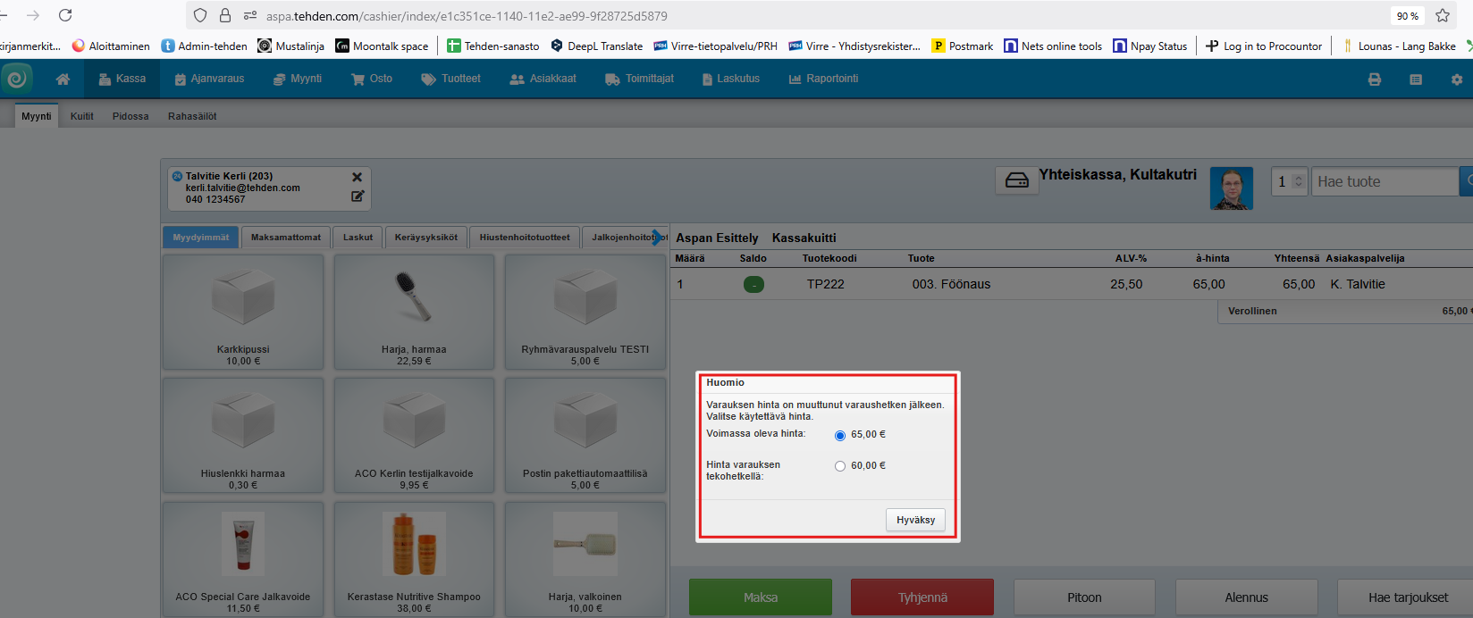 - Jos asiakas varaa ajan Avoinna24:n kautta, mutta maksaa sen vasta paikan päällä, kun uudet hinnat ovat astuneet voimaan, hän maksaa oletuksena palvelusta maksuhetkellä voimassa olevan eli uuden hinnan.