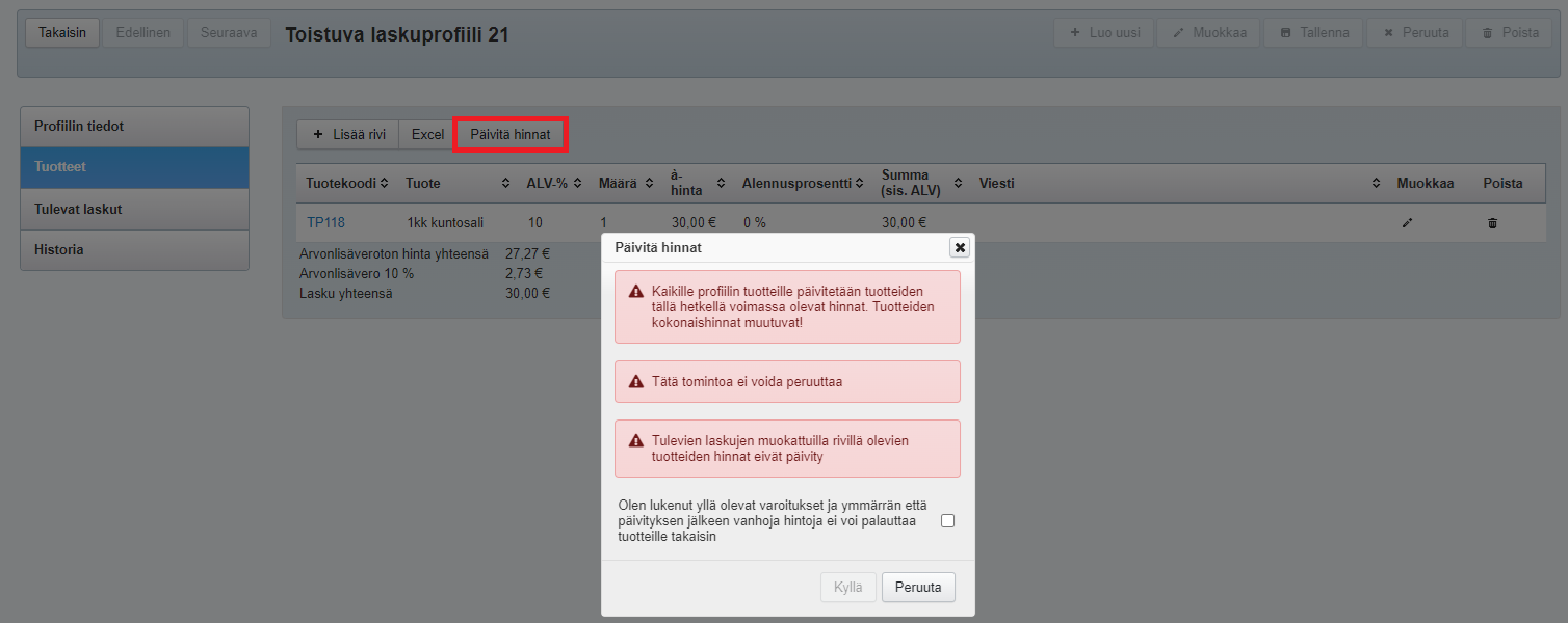 - Tehden varoittaa, että kaikkien profiilin tuotteiden hinnat päivitetään vastaamaan voimassa olevia hintoja. Huom! Jos olet tehnyt rivikohtaisia muutoksia tuleville laskuille, päivitys ei vaikuta näiden rivien hintoihin.