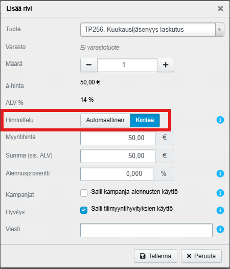 Valinta määrittää sen, onko uuden laskuprofiilin tuotteita lisättäessä (tai kun laskuprofiili luodaan automaattisesti Liity jäseneksi -ominaisuuden kautta) Hinnoittelu-kohdassa valittuna Automaattinen vai Kiinteä::