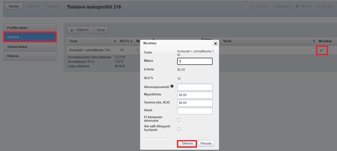 - Klikkaa muokkauskuvaketta sillä tuoterivillä, jonka hintaa olet muuttanut.