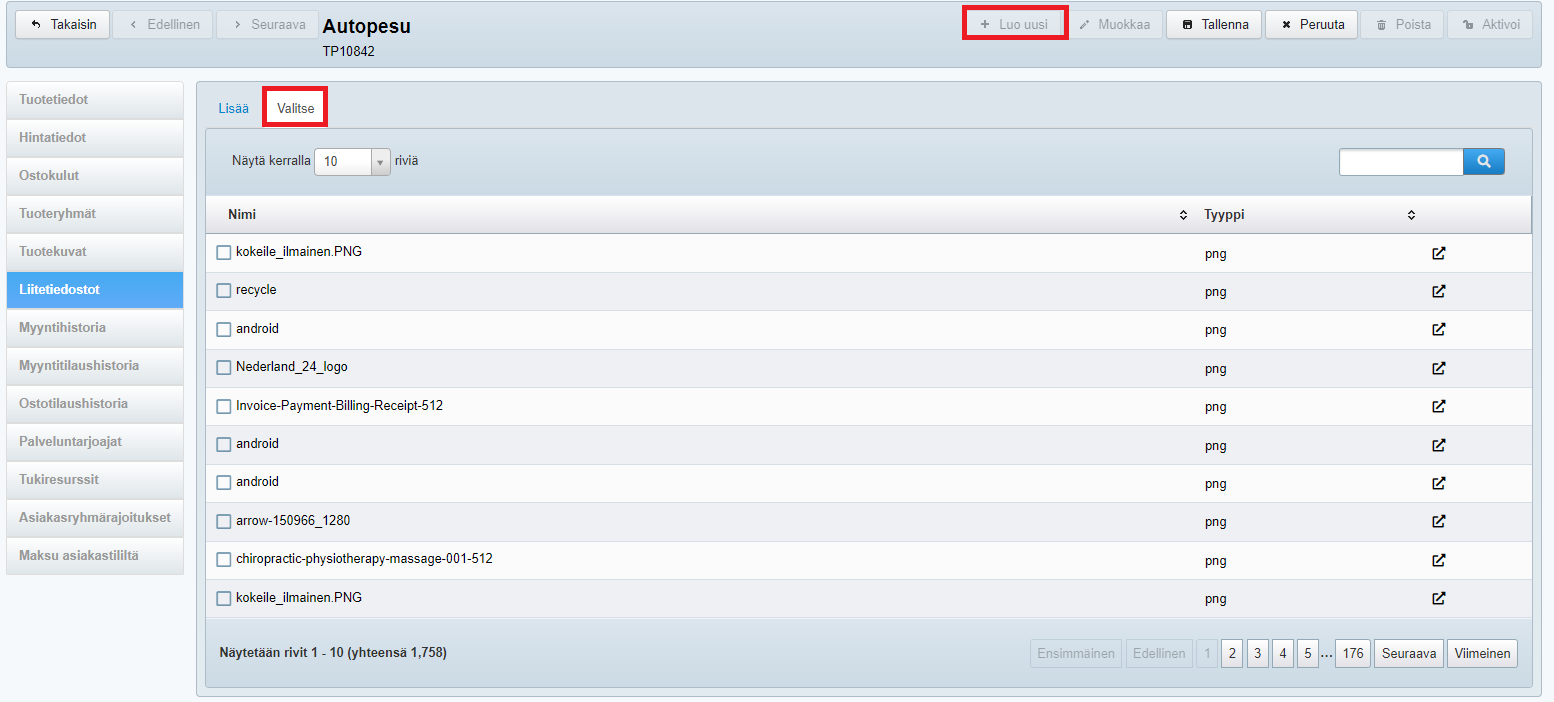 - Siirry tuotteen Liitetiedostot-välilehdelle ja valitse Luo uusi.