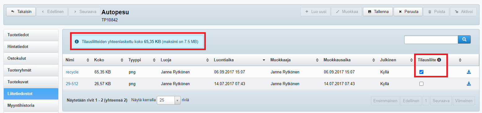 - Jos haluat lähettää lisäämäsi liitetiedoston automaattisesti asiakkaalle, joka varaa kyseisen palvelun/ostaa kyseisen tuotteen Avoinna24:n kautta, siirry muokkaustilaan. Voit nyt valita Tilausliite-sarakkeen niissä tiedostoissa, jotka haluat toimittaa asiakkaalle. Tilauksen liitteenä toimitettavien tiedostojen yhteiskoko saa olla enintään 7,5 MB, ja Tehden varoittaa, jos liitteiden koko on liian suuri: