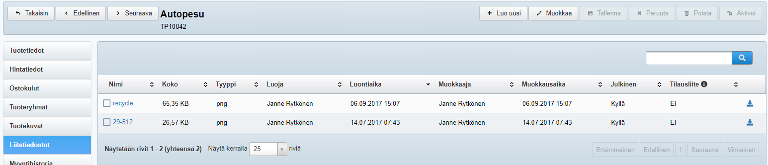 - Kun olet lisännyt haluamasi tiedostot, näet ne listauksena. Listauksessa näkyy mm. tiedoston koko, luontiaika, tieto liitteen julkisuudesta sekä painike, josta voit ladata tiedoston omalle koneellesi: