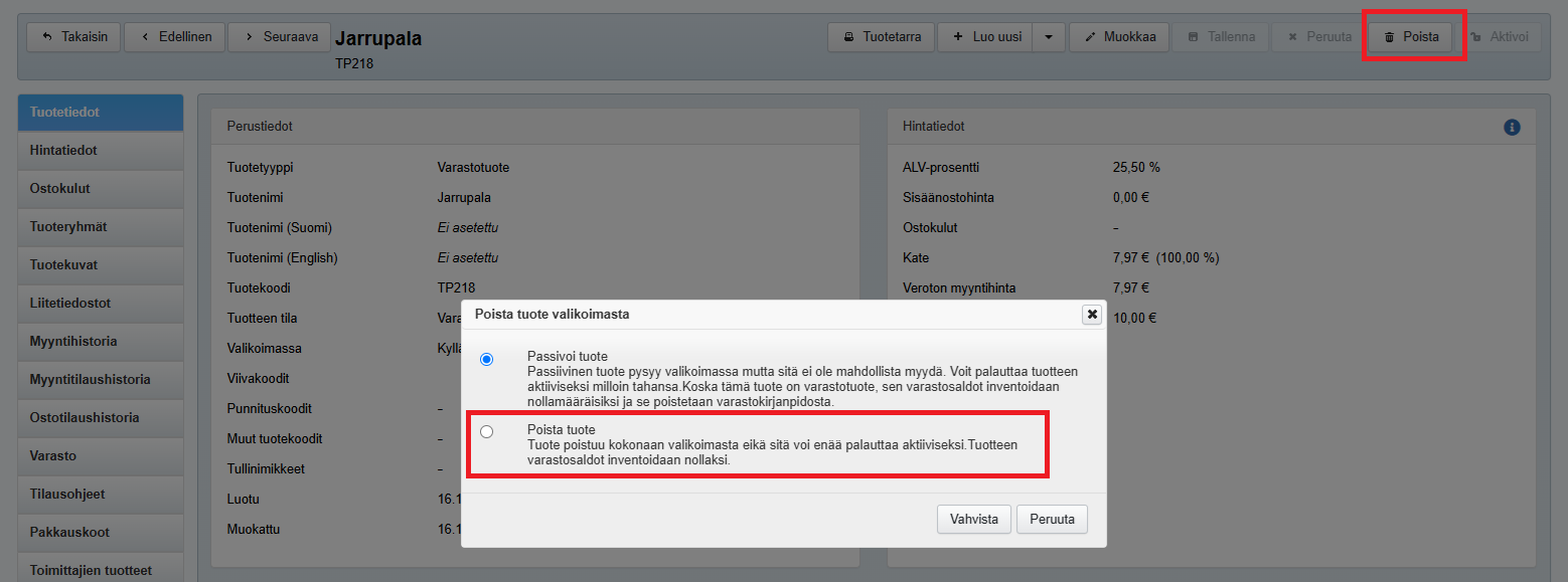 Valitse tuote taulukosta ja klikkaa tuotteen tietokortilla Poista-painiketta. Valitse avautuvassa ikkunassa, että tuote poistetaan: