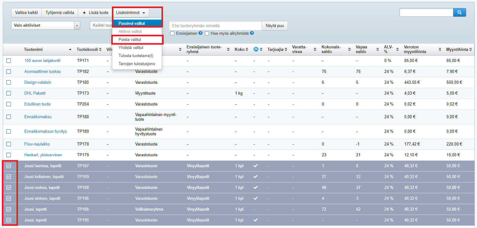 - Voit poistaa/passivoida useita tuotteita kerrallaan valitsemalla Tuotteet-ohjelmassa halutut tuotteet ja valitsemalla sitten Lisävalinnat-painikkeen takaa Passivoi valitut tai Poista valitut: