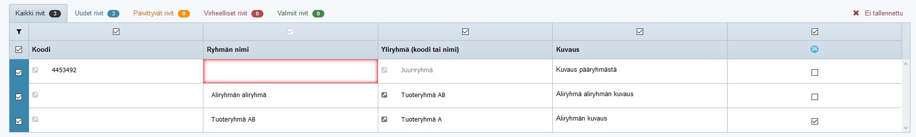 - Muokkaa virheellisiä tietoja ja klikkaa taulukon oikeassa yläkulmassa Tallenna muutokset -painiketta. Kun virheellisiä rivejä ei enää ole, oikean yläkulman Aloita tuonti -painike aktivoituu.