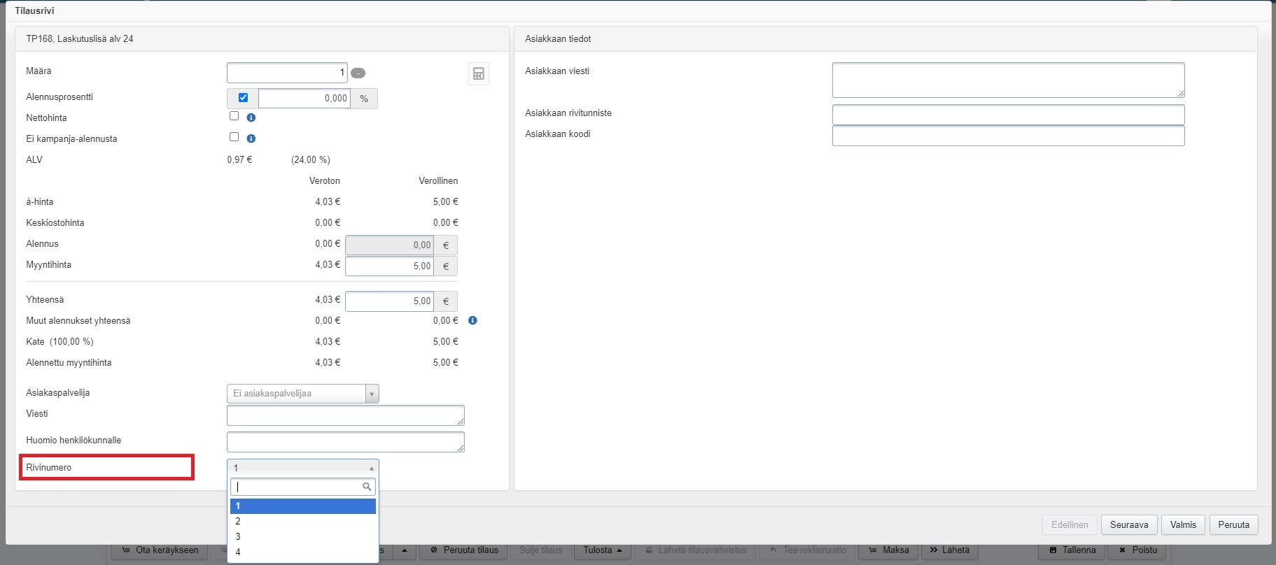 - Tilausrivin Rivinumero-tiedolla voi tilausrivien järjestystä muuttaa muutenkin. Pääset vaihtamaan rivinumeroa, kun otat yksittäisen tilausrivin muokkaustilaan:
