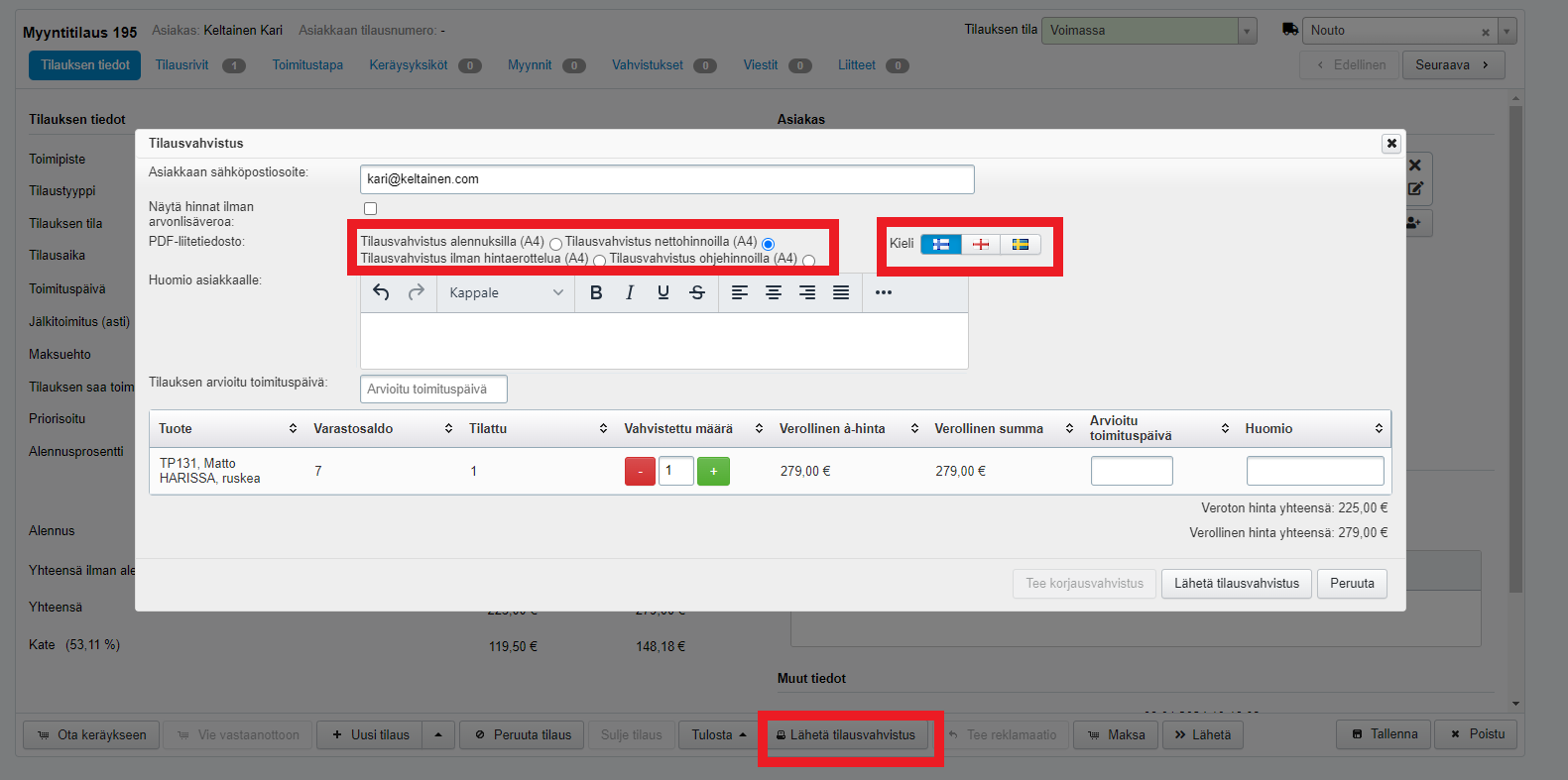 - Kun tilauksen tilana on Voimassa, Tilauksesta voidaan myös lähettää tilausvahvistus (myyntitilauksen alareunan Lähetä tilausvahvistus -painike muuttuu aktiiviseksi). Voit valita tilausvahvistuksen kielen sekä sen, mitä pohjaa haluat tilausvahvistuksessa käyttää - lue lisää yrityksen käytössä olevista tulostepohjista ohjeesta Tulosteiden hallinta. Asiakkaan sähköpostiosoite -kenttään voi lisätä useita osoitteita pilkulla eroteltuna tai enteriä painamalla.