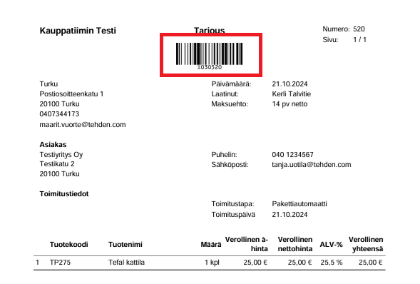 - Vinkki: Jos yrityksen käytäntönä on tulostaa tilausvahvistus asiakkaalle, ja asiakas palaa tämän tulostetun vahvistuksen kanssa noutamaan valmista tilausta, löydät tilauksen tiedot helposti Tehdenistä skannaamalla tilausvahvistuksen viivakoodin: