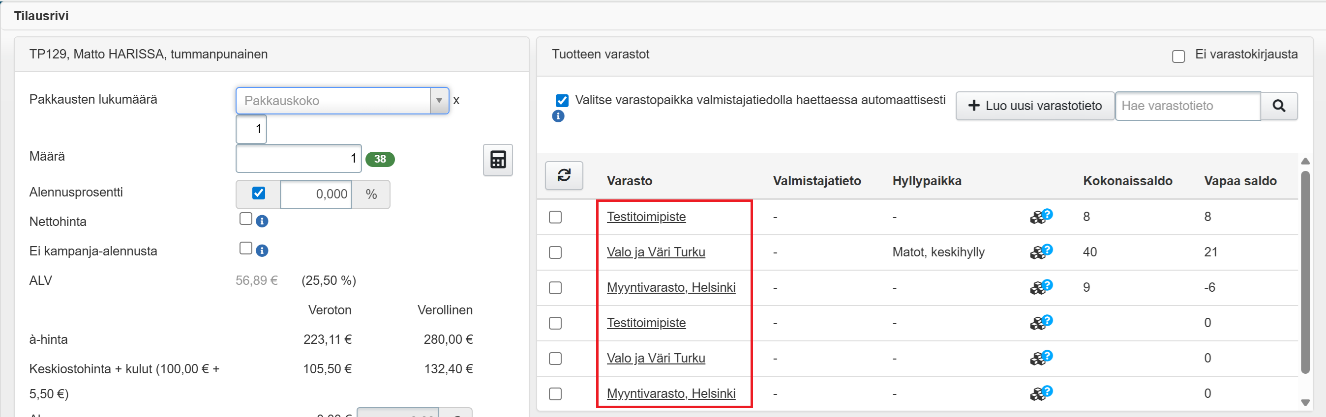 - Huom! Varastolistauksessa näytetään kaikkien mahdollisten varastojen nimi kahteen kertaan.