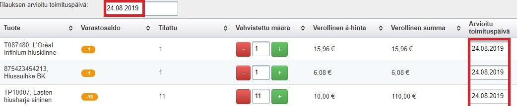 - Jos tilausvahvistuksessa halutaan ilmoittaa arvioitu toimituspäivä ja se on sama kaikilla tuotteilla, kannattaa käyttää tilausrivien yläpuolella olevaa Tilauksen arvioitu toimituspäivä -kenttää: siihen täytetty päivämäärä kopioidaan kaikille tilausriveille.