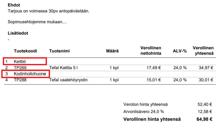 Tekstiriveillä ryhmitelty tarjous tulostuu asiakkaalle seuraavasti: