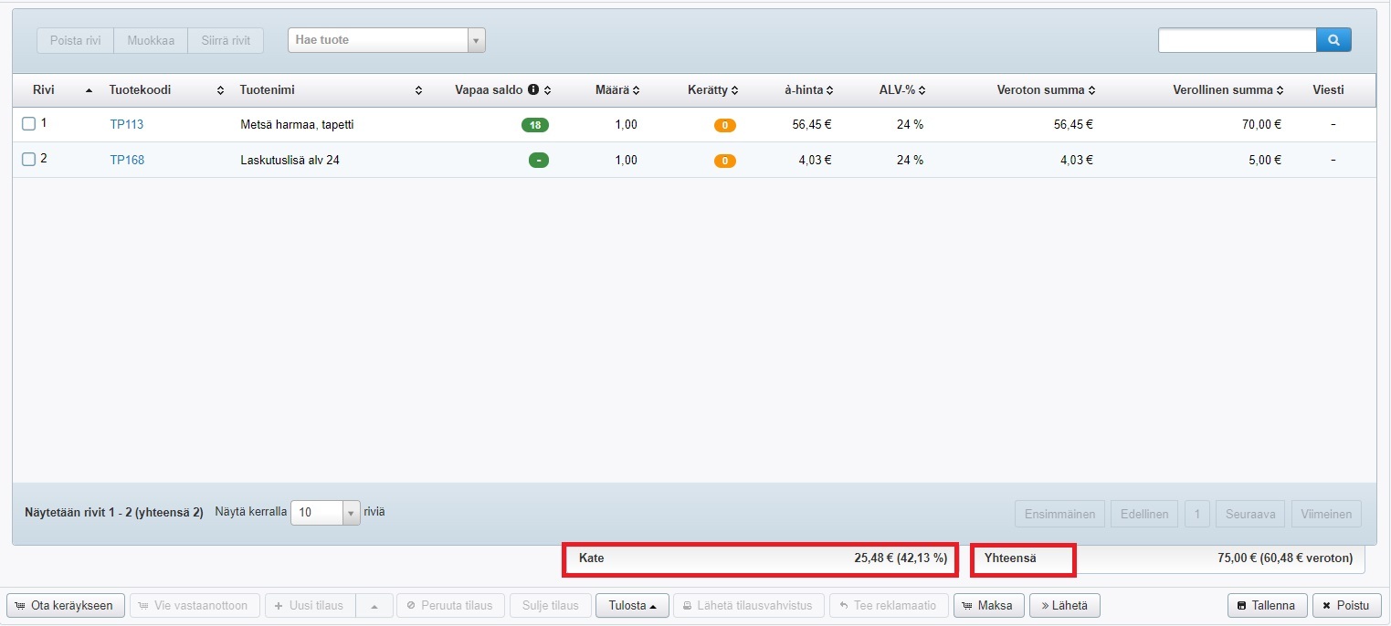 - Kun napsautat myyntitilauksen tilausrivien alla näkyvää Yhteensä-tekstiä, näet myyntitilauksen kateprosentin ja euromääräisen katteen: