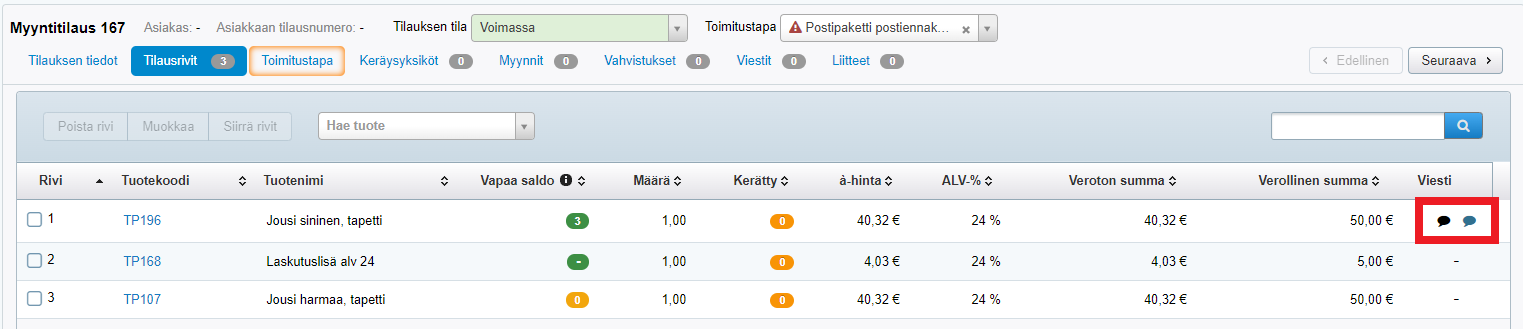 - Huomio henkilökunnalle -kenttään voi kirjoittaa keräysohjeen, väritoiveen tms. sisäistä tietoa, jota ei haluta mukaan tulosteille mutta joka löytyy Tilausrivit-välilehdeltä, kun kursorin vie sinisen puhekuplan päälle: