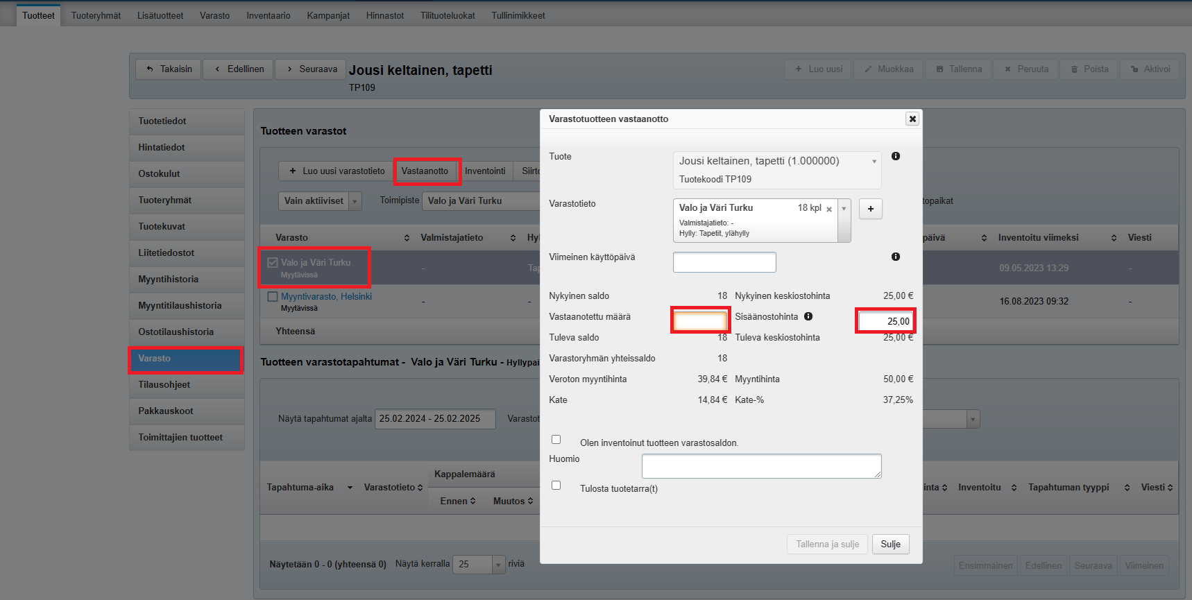 Kun tuotteelle on tuotekortilla luotu uusi varastotieto, tuotetta voi heti ottaa vastaan varastoon: