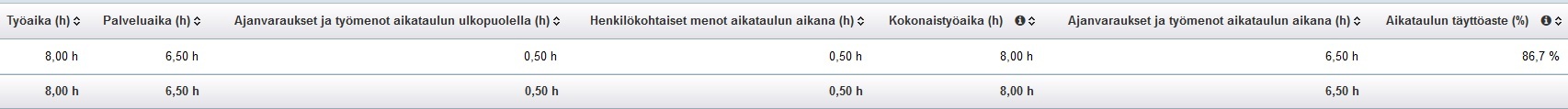 Kokonaistyöaika-sarakkeessa oleva tuntimäärä on siis työntekijän päivän aikana tekemien työtuntien määrä. Kokonaistyöajaksi lasketaan työaika, palveluaika sekä aikataulun ulkopuoliset ajanvaraukset, ja näistä vähennetään aikataulun aikana olevat henkilökohtaiset menot. Jos työ- ja palveluajat menevät kalenterissa päällekkäin, vain toinen niistä lasketaan.