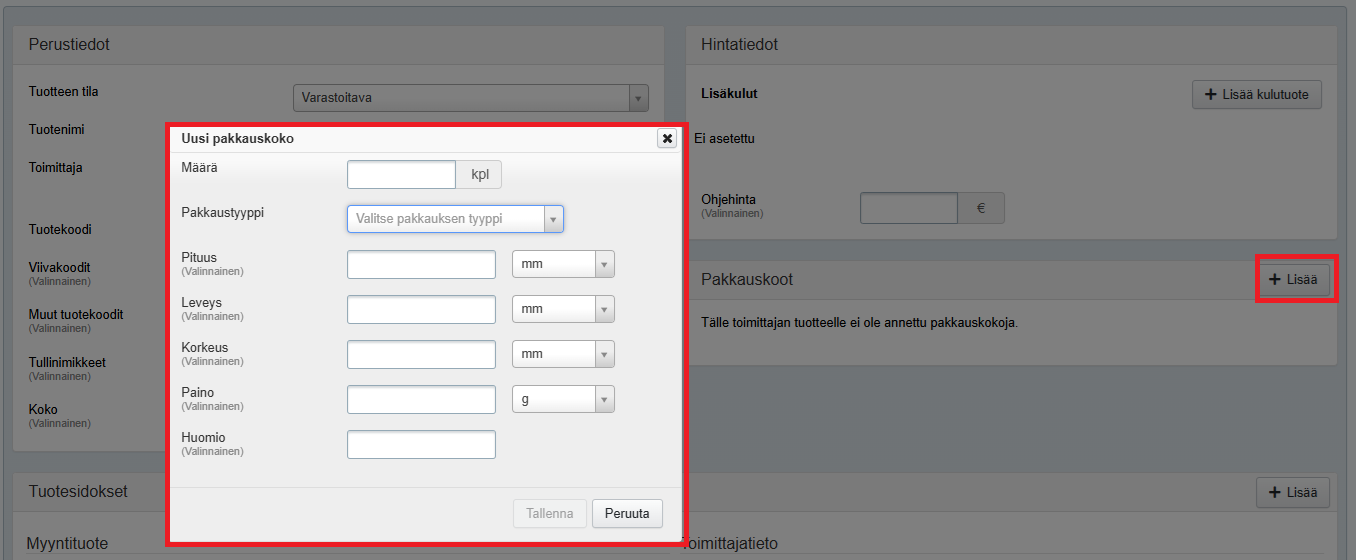 Tarkempaa tietoa pakkauskoista ja niiden luomisesta löydät ohjeesta Pakkauskoot ja tukkupakkausten myynti. Muista, että Intrastat-raportille painotiedot lasketaan toimittajan tuotteen tietojen kautta, eli niitä ei hallinnoida myyntituotteen Pakkauskoot-välilehdellä.