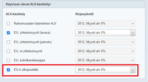 Varmista, että Tehdenin Yritysasetusten Veroluokat-välilehdellä on otettu käyttöön ALV-käsittely EU:n ulkopuolella: