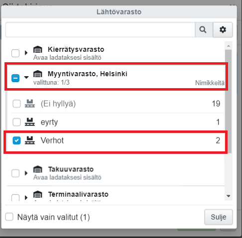 - Voit valita useita hyllypaikkoja ja/tai varastoja. Kun valinnat on tehty, napauta Sulje-painiketta.