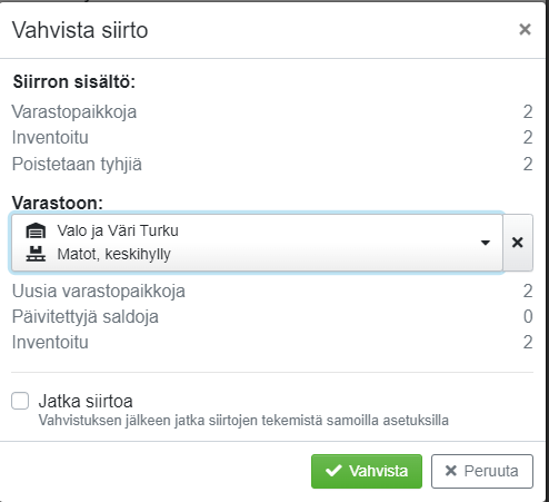 - Kun kaikki halutut tuotteet on valittu ja tarvittaessa määrät inventoitu samalla, tuotteet saadaan siirrettyä uuteen varastoon Siirrä-painikkeesta. Vahvista siirto -näkymässä, jossa näytetään myös yhteenveto siirrettävien hyllyjen/tuotteiden määrästä: