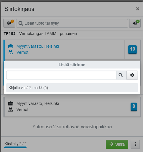 - Kun lähtö- ja tulovarasto on valittu, voit alkaa skannata siirrettävien tuotteiden viivakoodeja tai lisätä tuotteita siirtoon niiden tuotekoodin, nimen tai hyllypaikan perusteella: