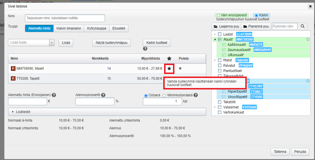 Tuotteita voi lisätä kampanjaan joko yksitellen hakemalla tuotteen nimellä tai tuoteryhmittäin tuoteryhmäpuun kautta. Voit myös valita, että kampanja koskee kaikkia tuotteita.