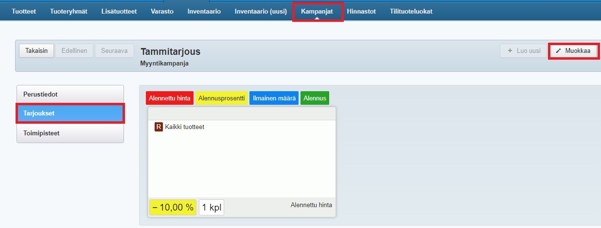 Jos kampanjatarjousta on jo käytetty kassalla, kyseistä tarjousta ei voi enää muokata, esim. lisätä tuotteita. Kampanjaa ei myöskään voi poistaa, jos se on jo astunut voimaan. Voit kuitenkin poistaa tarjouksen käytöstä passivoimalla sen sekä lisätä kampanjaan uusia tarjouksia kampanjan voimassaoloaikana: