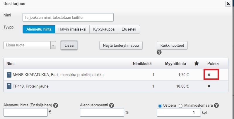 - Jos lisäät vahingossa tarjoukseen väärän tuotteen, voit poistaa sen Poista-sarakkeen rastista klikkaamalla: