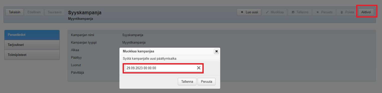 Jo päättyneen kampanjan pääsee helposti aktivoimaan kampanjan yläpalkin Aktivoi-painikkeesta: