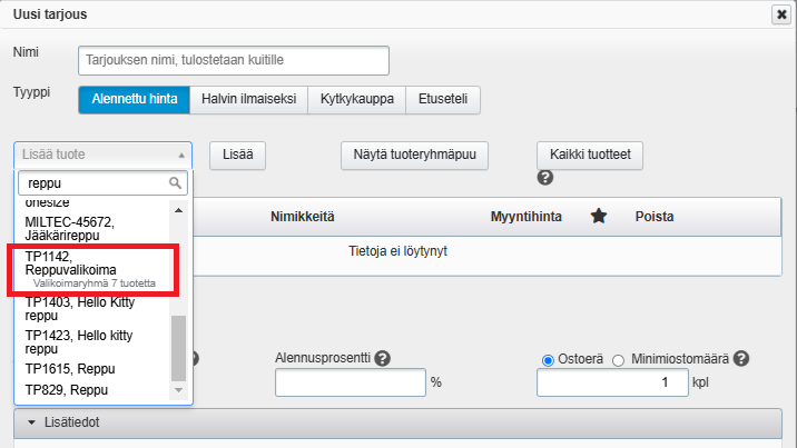- Jos tarjous annetaan vain tietyistä tuotteista, kannattaa tuotteet lisätä tarjoukseen yksitellen, Lisää tuote -tuotehaun kautta. Kun olet valinnut oikean tuotteet, muista klikata Lisää-painiketta jokaisen tuotteen kohdalla: