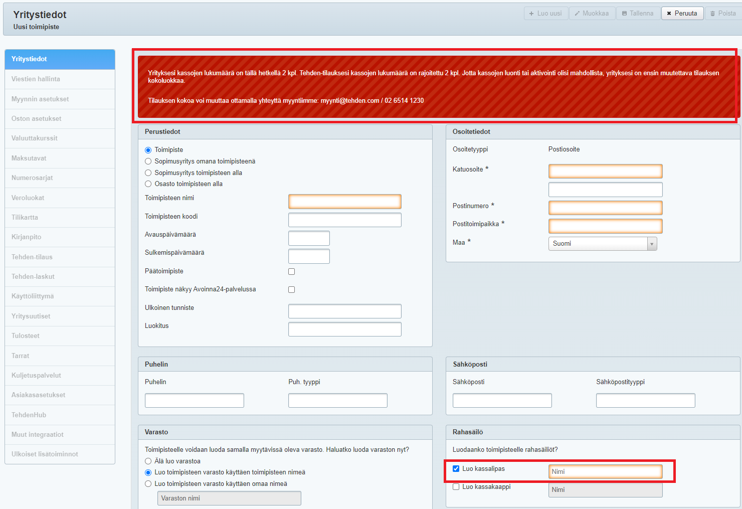 - Huomioi, että jos haluat kirjata uudelle toimipisteelle myyntejä (myös esim. A24-verkkokaupan tai laskutuksen kautta, eli vaikka toimipisteellä ei tehtäisi tavallista kassamyyntiä), uuden kassan luonti on pakollista. Jos valitset kassalippaan luomisen, mutta tilaukseesi ei sisälly riittävän montaa kassaa, Tehden kehottaa kasvattamaan tilauksen kokoluokkaa olemalla yhteydessä myyntiin: