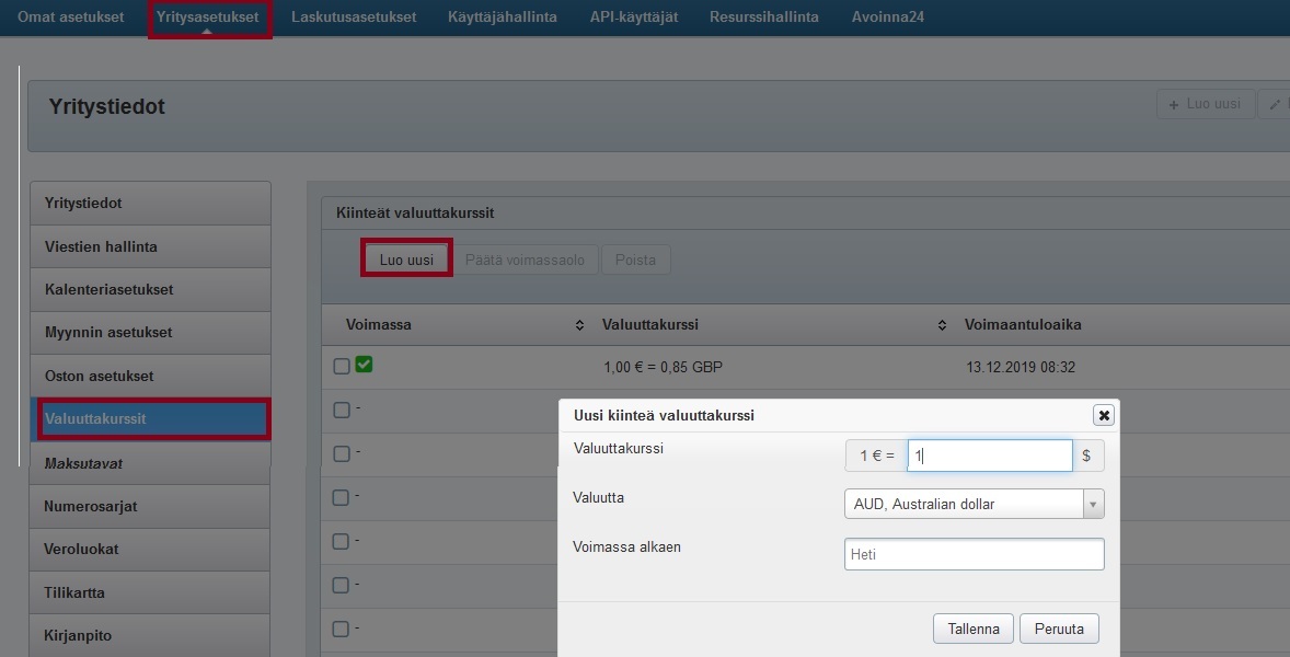 - Oletuksena valuuttakurssi tulee voimaan heti, mutta voit määritellä myös tulevaisuudessa olevan ajan.