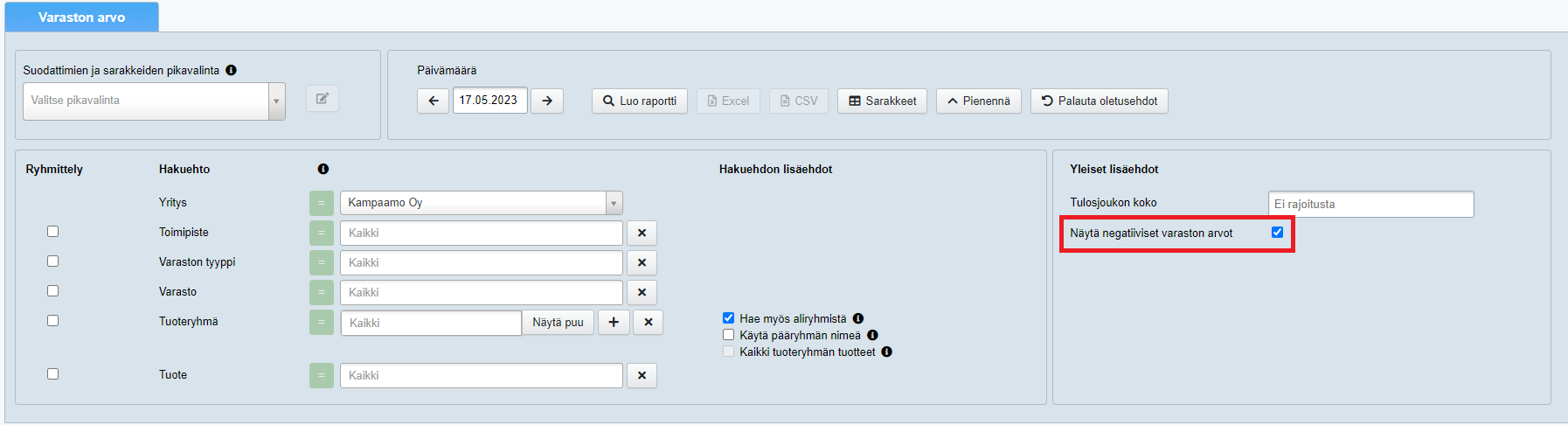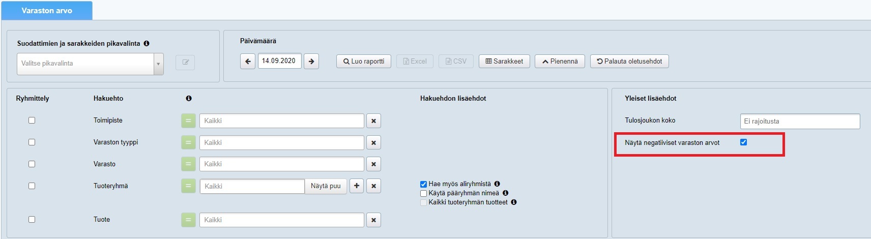 Jos haluat, että raportilla näytetään myös negatiiviset varaston arvot, sekin onnistuu: valitse Yleiset lisäehdot -osiossa kohta Näytä negatiiviset varaston arvot: