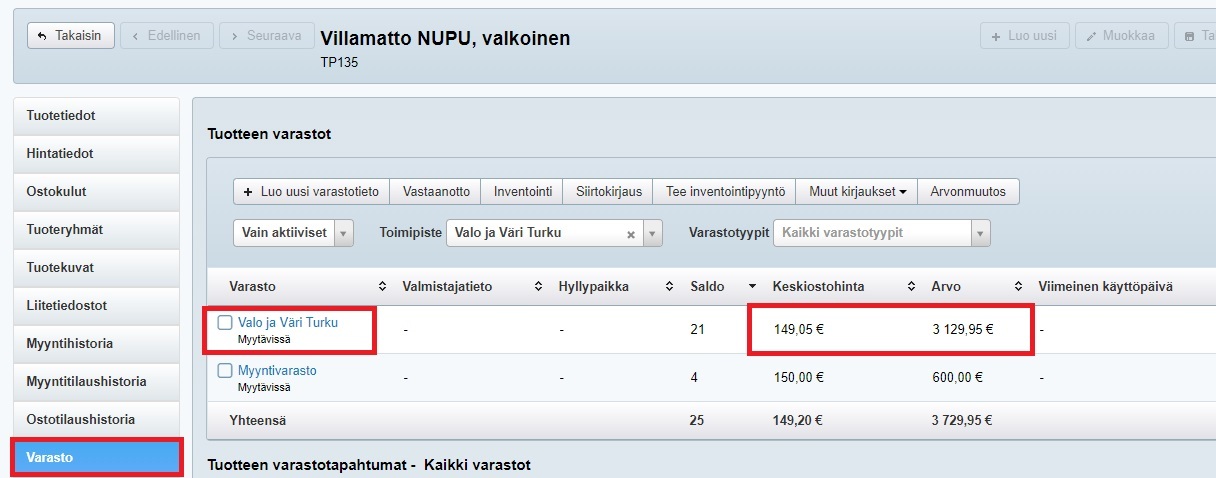 Veroton arvo -sarake puolestaan ilmaisee arvon varaston keskiostohinnan perusteella. Varaston keskiostohintaa pääsee tarkastelemaan tuotteen Varasto-välilehdellä: