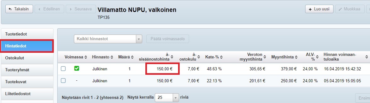 Arvo ostohinnalla -sarakkeen summa lasketaan sen perusteella, mikä tuotteelle on määritetty sisäänostohinnaksi tuotteen Hintatiedot-välilehdellä: