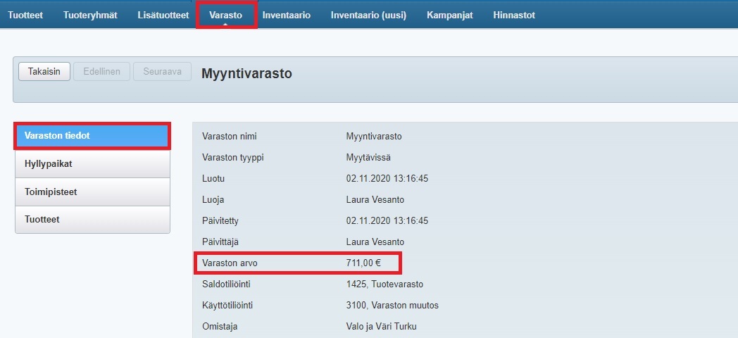 Huom! Tehdenin Tuotteet-ohjelmasta löytyvässä Varasto-ohjelmassa ilmoitetaan myös kunkin varaston arvo: