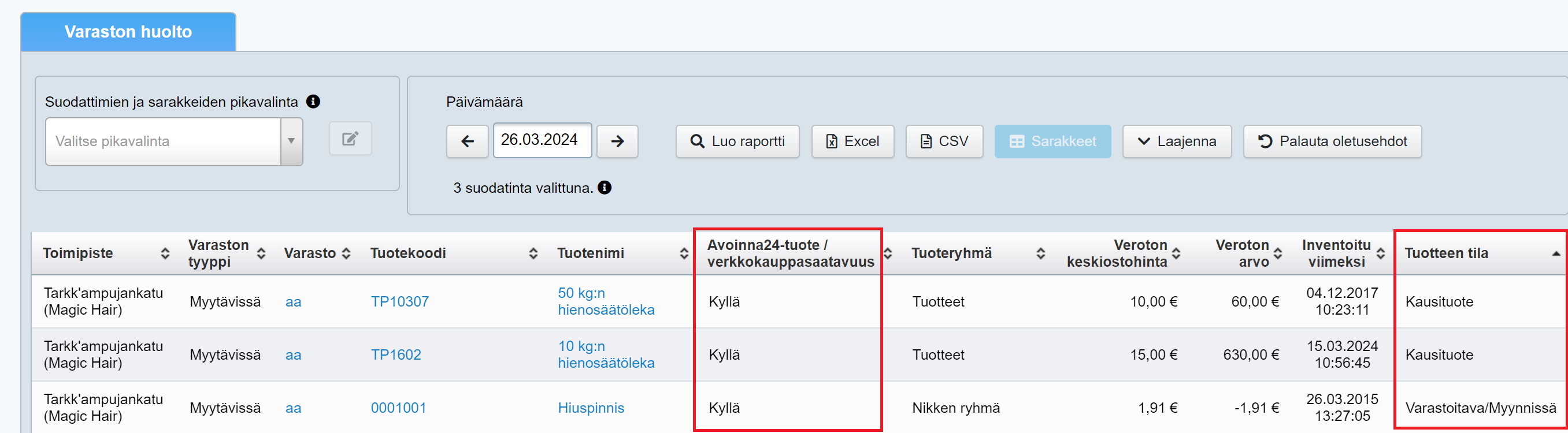 Varaston huolto -raportilta löytyy myös tieto siitä, onko tuote Avoinna24-tuote tai myydäänkö sitä integroidussa verkkokaupassa (verkkokauppatuote). Lisäksi raportin Sarakkeet-valikosta voi lisätä oletusraporttiin myös Tuotteen tila- sarakkeen, jolloin saat raportilta tiedon tuotteen tilasta (lue lisää: Tuotteen tila).