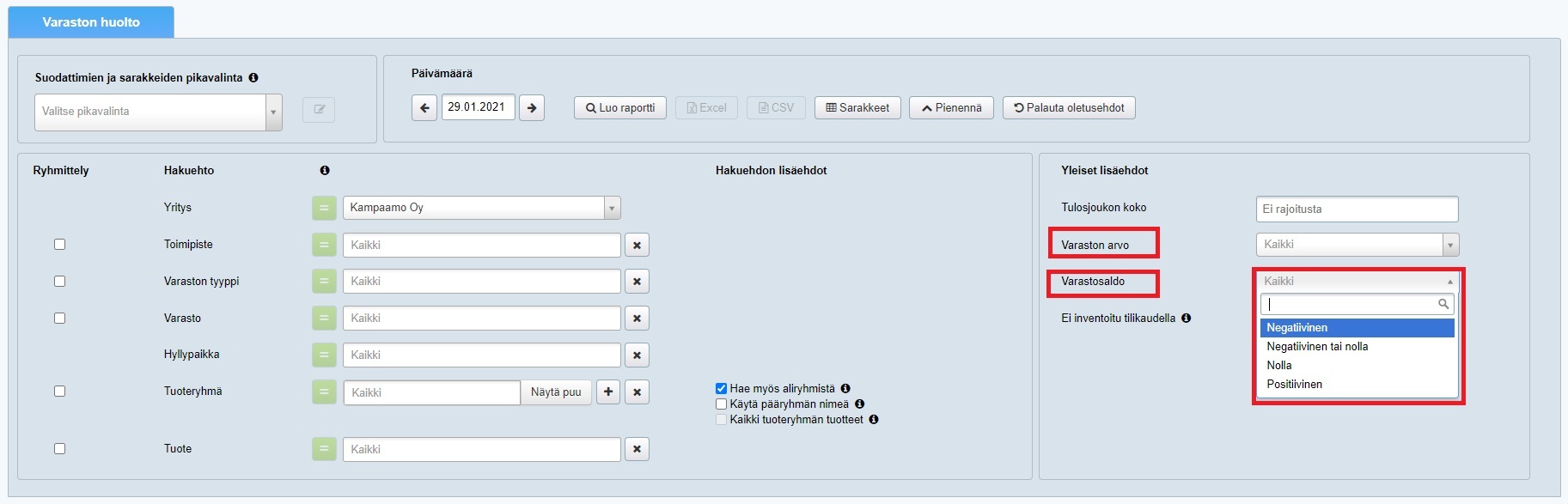 Yleiset lisäehdot-osiossa voit valita varastosaldon tai tuotteen varaston arvon mukaan (negatiiivinen, negatiiivinen tai nolla, nolla tai positiivinen) mitkä tuotteet näytetään raportilla.