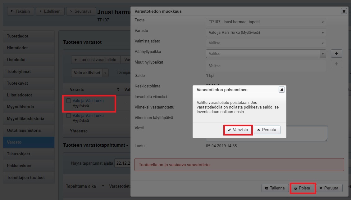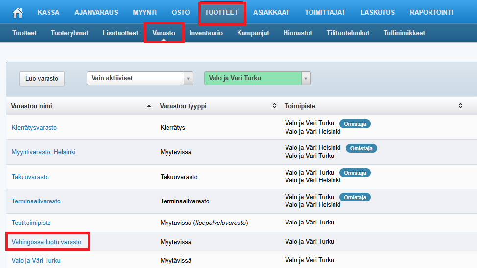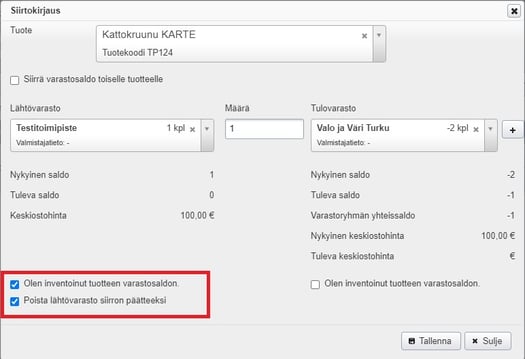 - Jos varastoon on esim. testimielessä lisätty tuotteita, poista tai siirtokirjaa tuotteet edellä ohjeistetusti.