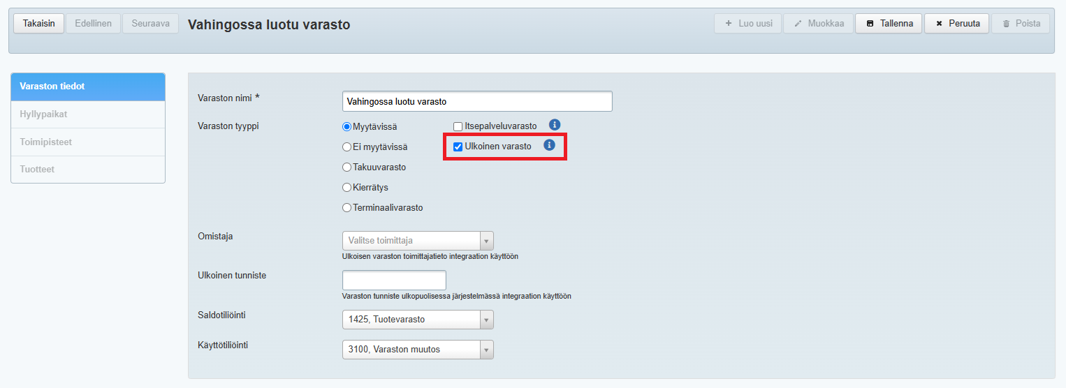 - Napsauta Muokkaa-painiketta ja valitse kohta Ulkoinen varasto: