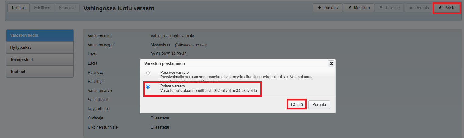 - Huom! Varaston poisto ei poista varastoa Tehdenin tietokannasta, joten varasto löytyy Tehdenin raporteilta myös poiston jälkeen.