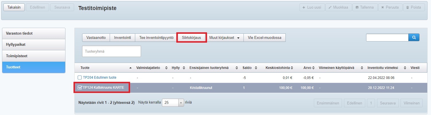 - Valitse varaston tuotteet yksi kerrallaan ja klikkaa Siirtokirjaus-painiketta: