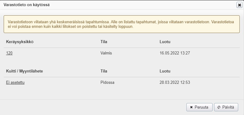 - Avautuvassa ikkunassa valitse Poista, jonka jälkeen aukeaa vielä varastotiedon poistamisen vahvistusikkuna: