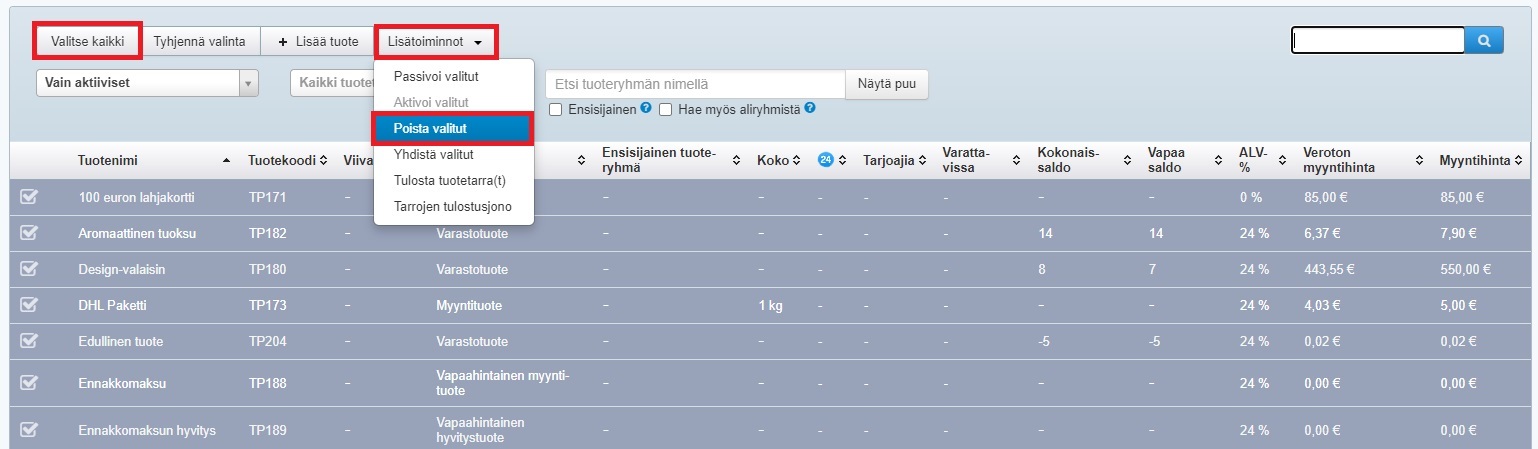 - Siirry Tuotteet-ohjelmaan ja valitse vasemmasta yläkulmasta Valitse kaikki. (Jos joukossa on tuotteita, joita et halua poistaa, poista valinta niiden kohdalta.)