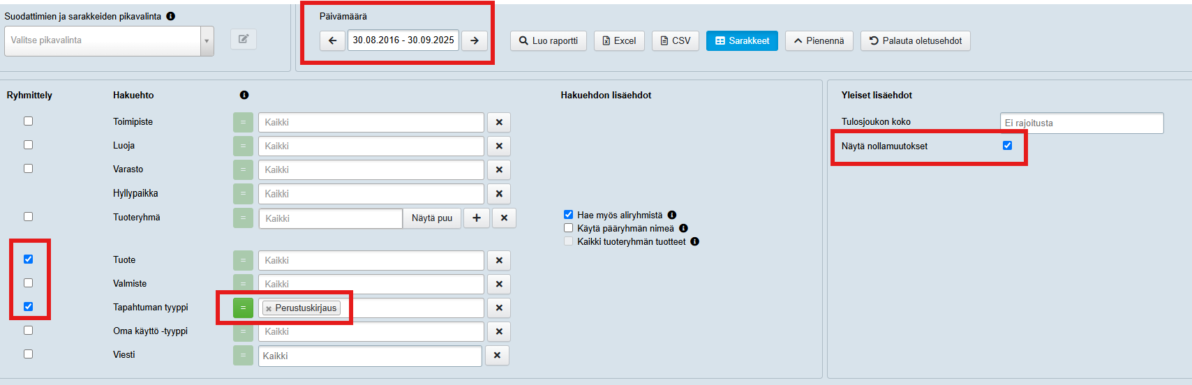- Varmista, että raportille on valittu sarakkeet Tuotekoodi, Tuotenimi, Tapahtuman tyyppi ja Tapahtumia.