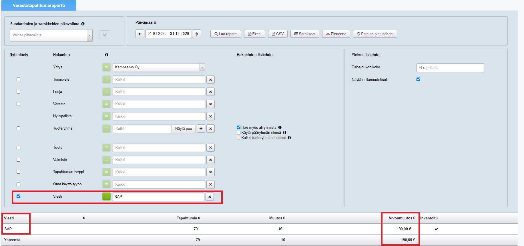 Jos et laita rastia Viesti-rivin ryhmittelyruutuun, raportti näyttää jokaisen varastokirjauksen omalla rivillään eli saat kerralla listauksen kaikista projektiin käytetyistä varastotavaroista.