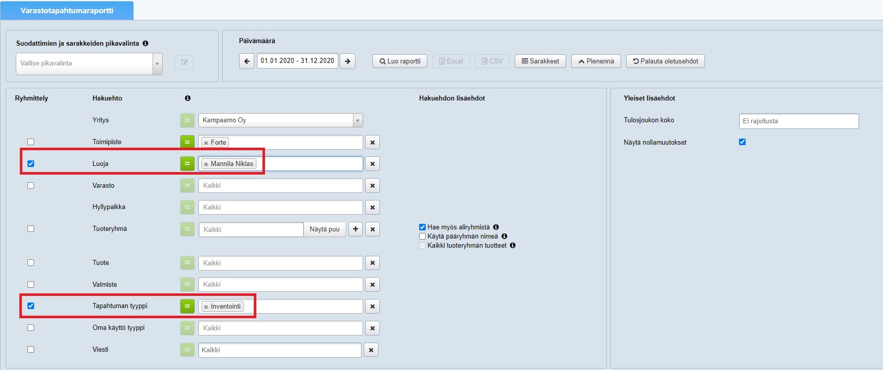 Valitse raportilla haluamasi käyttäjät Luoja-kenttään (jos et tee valintoja, raportti näyttää kaikkien käyttäjien varastotapahtumat), valitse ryhmittely Tapahtuman tyypin mukaan ja valitse tällöin tapahtuman tyypiksi Inventointi ja/tai Saldokorjaus: